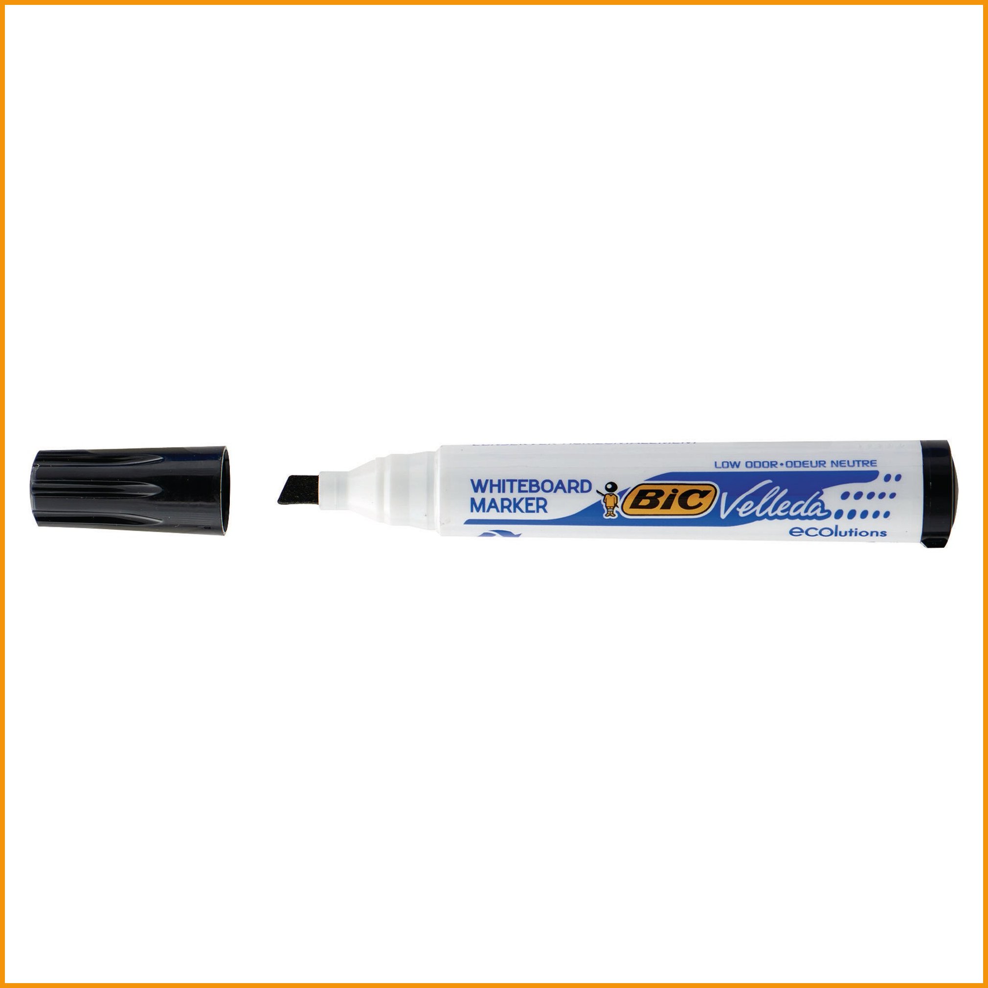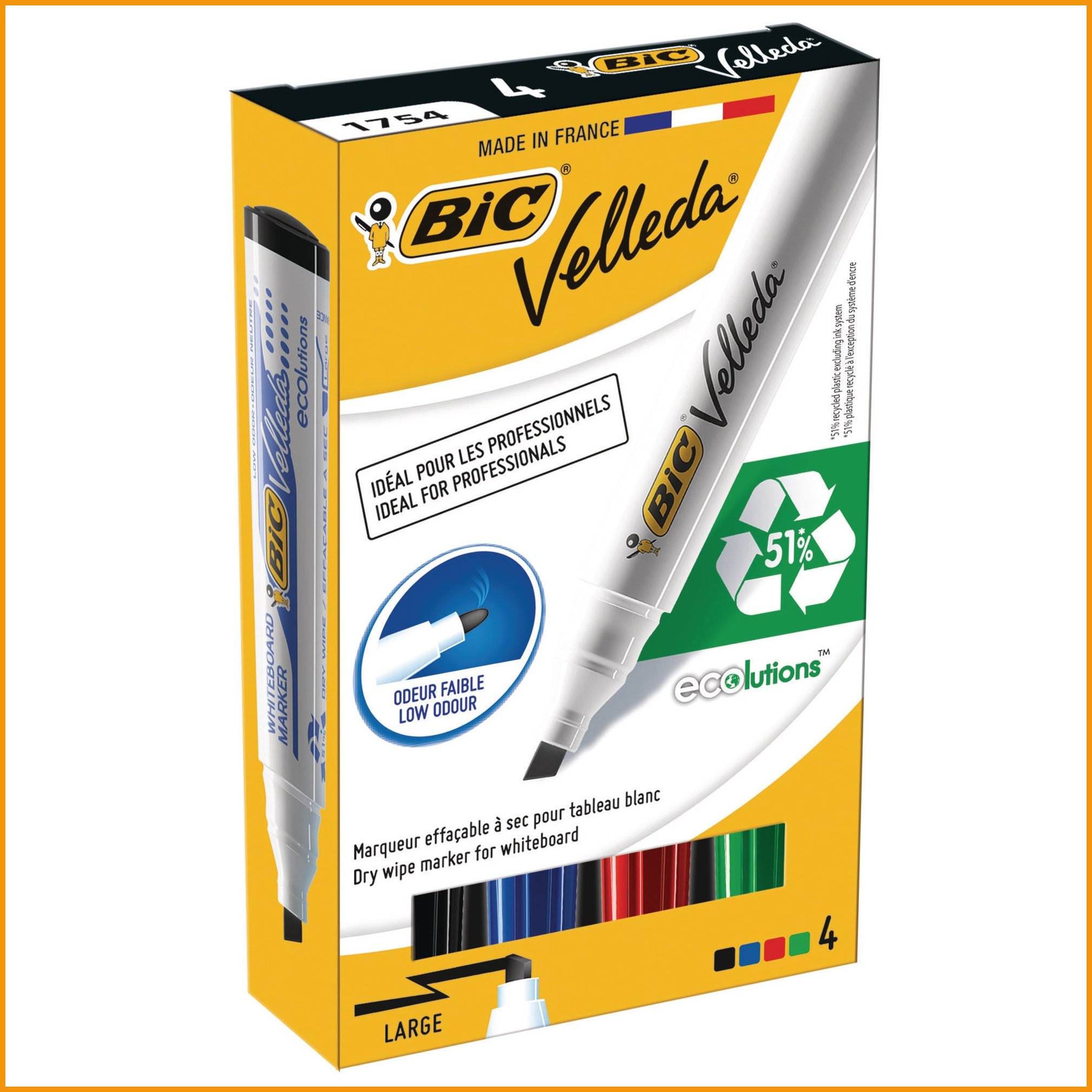 Bic velleda 1751 -valkotaulukynän alkoholipohjainen, lähes hajuton muste pyyhkiytyy pois kuivalla liinalla. ympäristöystävällinen kynä on valmistettu 51-prosenttisesti kierrätysmateriaalista. lajitelmassa on neljä väriä: sininen, punainen, vihreä ja musta. viisto kärki, viivan leveys 3 - 5,9 mm. Taulutussien minimitilaus 1 paketti = 4 kpl. Tukkupakkauksessa 88 kpl.Taulutussit toimitetaan 4 kappaleen erissä.