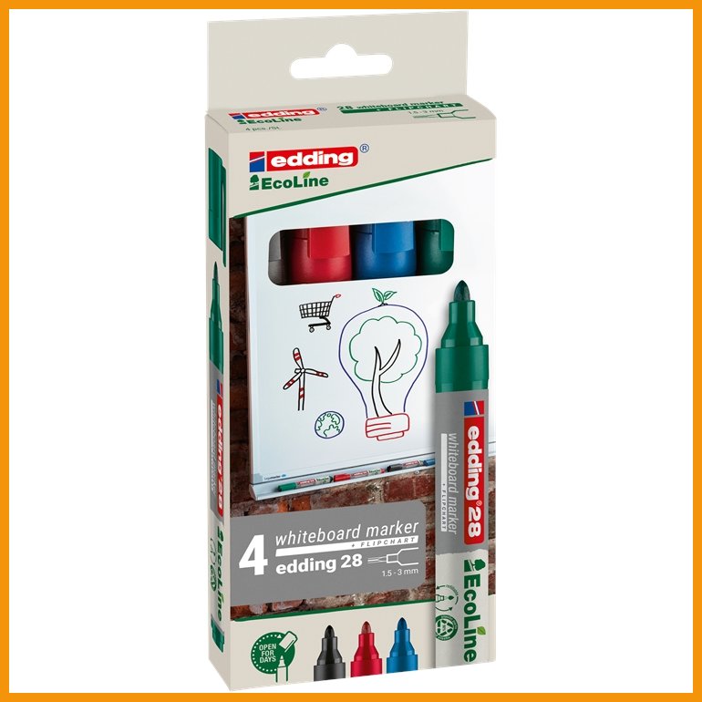 Edding 28 Ecoline on valkotaulukynä, jonka runko ja muut muoviosat on valmistettu vähintään 90-prosenttisesti kierrätysmateriaalista. Miedosti tuoksuva, valoa kestävä ja nopeasti kuivuva pigmenttimuste on kuivapyyhittävänä helppo pyyhkiä niin emali-, lasi- kuin melamiinipintaisilta valkotauluiltakin. Kynä ei kuivu, vaikka taskuklipsillä varustettu suojakorkki jäisi auki päiviksi. Korkki ja nuppi ovat musteen väriset.Kynän mustesäiliö on täytettävissä ja saatavilla on jopa vaihtokärkiä.