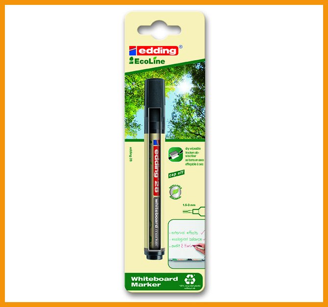Edding taulutussi musta 28 Ecoline on valkotaulukynä, jonka runko ja muut muoviosat on valmistettu vähintään 90-prosenttisesti kierrätysmateriaalista. Korkki ja nuppi ovat musteen väriset.Miedosti tuoksuva, valoa kestävä ja nopeasti kuivuva pigmenttimuste on kuivapyyhittävänä helppo pyyhkiä niin emali-, lasi- kuin melamiinipintaisilta valkotauluiltakin. Kynä ei kuivu, vaikka taskuklipsillä varustettu suojakorkki jäisi auki päiviksi.