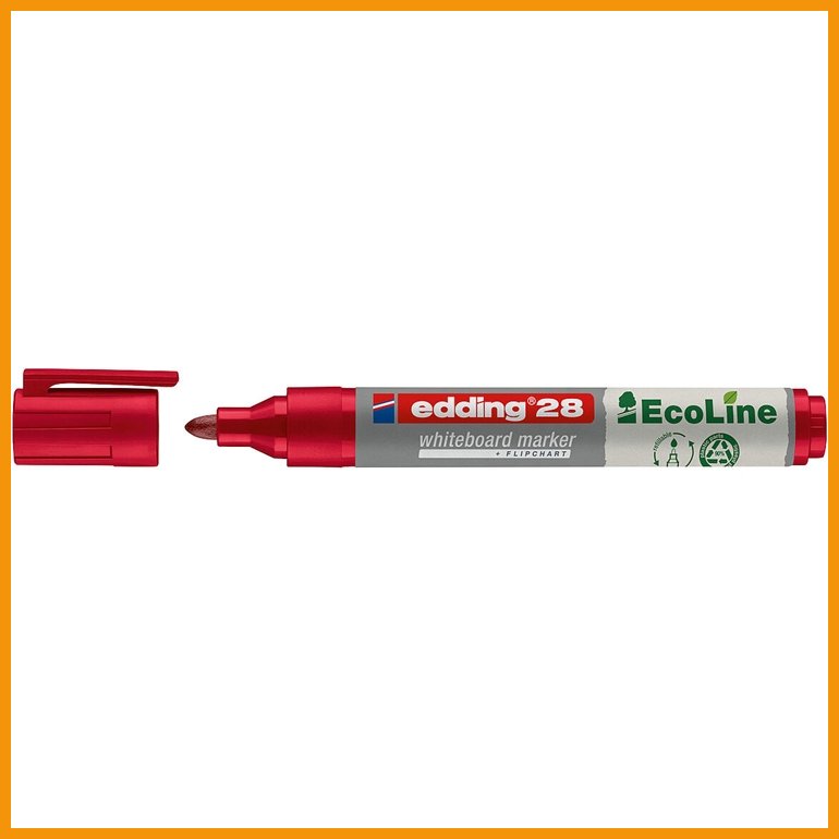 Edding taulutussi punainen 28 Ecoline on valkotaulukynä, jonka runko ja muut muoviosat on valmistettu vähintään 90-prosenttisesti kierrätysmateriaalista. Miedosti tuoksuva, valoa kestävä ja nopeasti kuivuva pigmenttimuste on kuivapyyhittävänä helppo pyyhkiä niin emali-, lasi- kuin melamiinipintaisilta valkotauluiltakin. Kynä ei kuivu, vaikka taskuklipsillä varustettu suojakorkki jäisi auki päiviksi. Korkki ja nuppi ovat musteen väriset.Kynän mustesäiliö on täytettävissä ja saatavilla on jopa vaihtokärkiä.