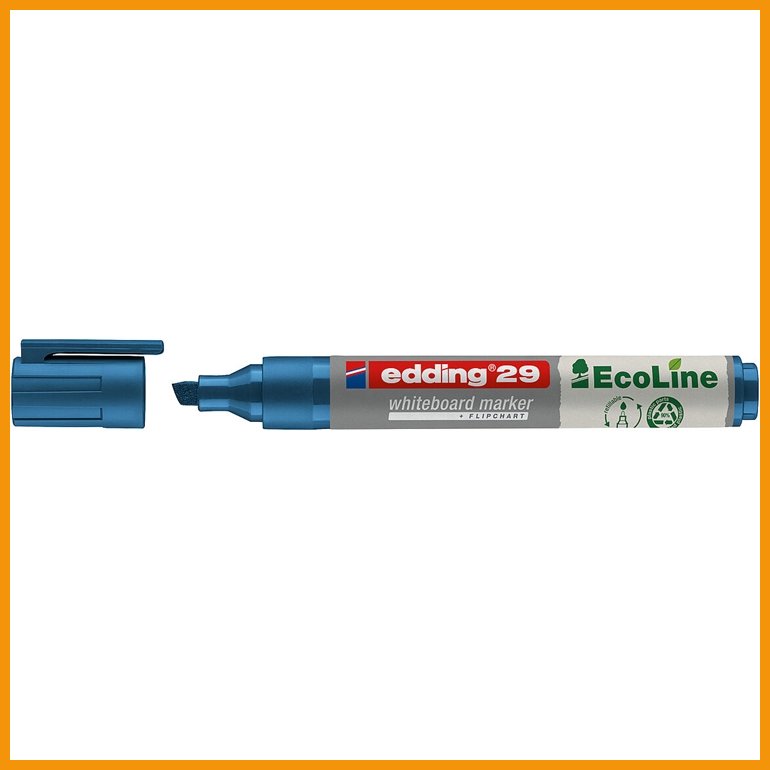 Edding taulutussi sininen 29 Ecoline -valkotaulukynän runko ja muut muoviosat on valmistettu vähintään 90-prosenttisesti kierrätysmateriaalista. Miedosti tuoksuva, valoa kestävä ja nopeasti kuivuva pigmenttimuste on kuivapyyhittävänä helppo pyyhkiä niin emali-, lasi- kuin melamiinipintaisilta valkotauluiltakin. Kynä ei kuivu, vaikka taskuklipsillä varustettu suojakorkki jäisi auki päiviksi. Korkki ja nuppi ovat musteen väriset.Kynän mustesäiliö on täytettävissä ja saatavilla on jopa vaihtokärkiä.