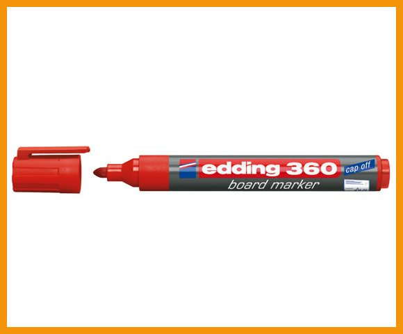 Edding taulutussi punainen 360 -valkotaulukynän alkoholipohjainen ja miedosti tuoksuva pigmenttimuste jättää selkeän jäljen, mutta on helppo pyyhkiä pois kaikenlaisilta valkotauluilta. Muovirunkoinen kynä ei kuivu, vaikka jäisi korkitta päiviksi. Korkissa on taskuklipsi.Mustesäiliö voidaan täyttää uudelleen, ja kynään on saatavana myös vaihtokärkiä.