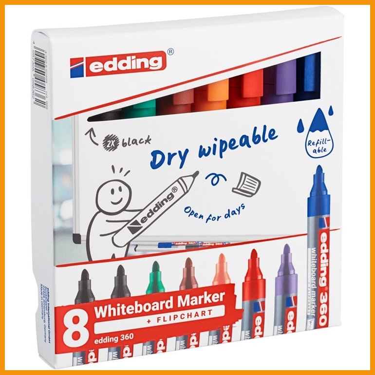 Edding 360 -valkotaulukynän alkoholipohjainen ja miedosti tuoksuva pigmenttimuste jättää selkeän jäljen, mutta on helppo pyyhkiä pois kaikenlaisilta valkotauluilta. Muovirunkoinen kynä ei kuivu, vaikka jäisi korkitta päiviksi. Korkissa on taskuklipsi.Mustesäiliö voidaan täyttää uudelleen, ja kynään on saatavana myös vaihtokärkiä.