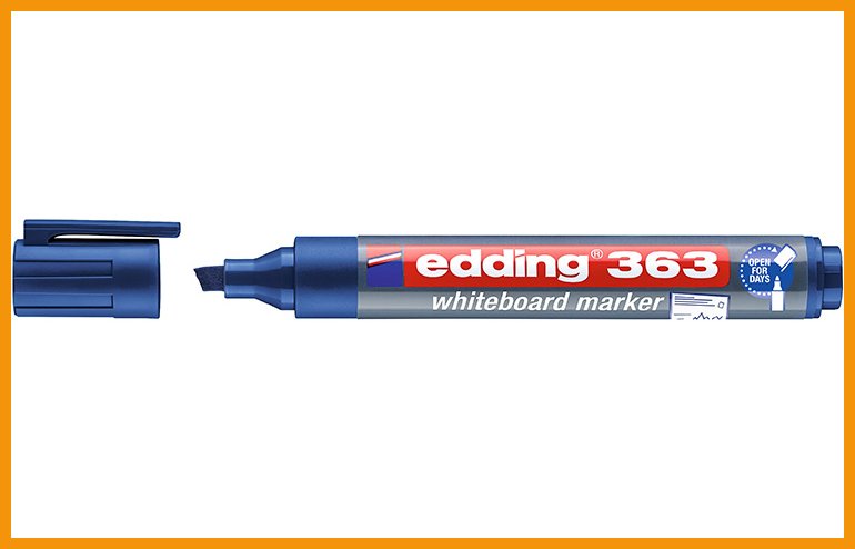 Edding taulutussi sininen 363 -valkotaulukynän alkoholipohjainen, valonkestävä ja miedosti tuoksuva pigmenttimuste jättää selkeän jäljen, mutta on helppo kuivapyyhkiä pois kaikenlaisilta valkotauluilta. Kynä soveltuu myös lehtiötauluille kirjoittamiseen. Muovirunkoinen kynä ei kuivu, vaikka jäisi korkitta päiviksi. Korkissa on taskuklipsi.Mustesäiliö voidaan täyttää uudelleen, ja kynään on saatavana myös vaihtokärkiä.