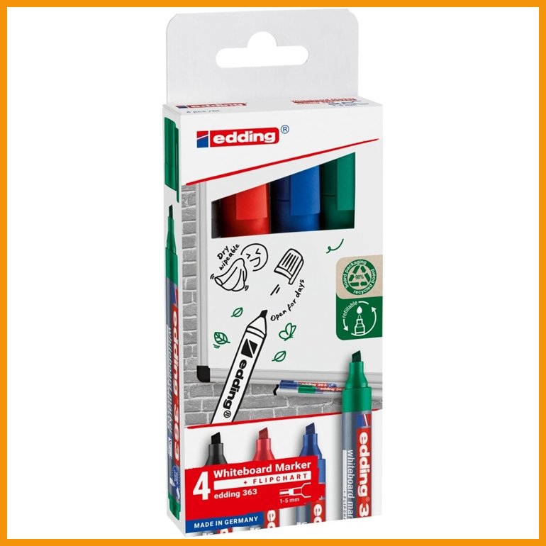 Hinta 6€ / 4 kplEdding ecoline 28 on ympäristöystävällinen valkotaulukynä, jonka muoviosista noin 90 % on valmistettu kierrätetyistä materiaaleista. kynän miedosti tuoksuva muste on helposti pyyhittävissä. kynän korkki voi olla auki useita päiviä musteen kuivumatta. pakkauksessa ...