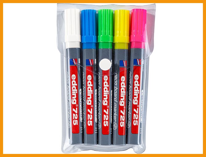 Edding 725 on valkotaulukynä, jonka neonvärinen muste erottuu erityisen hyvin tummilta pinnoilta. Vesipohjainen ja hajuton muste on kuivapyyhittävänä helppo pyyhkiä niin emali-, lasi- kuin melamiinipintaisilta valkotauluiltakin. Korkki ja nuppi ovat musteen väriset.Musteen väri: valkoinen ja neonsävyiset sininen, vihreä, keltainen ja pinkki