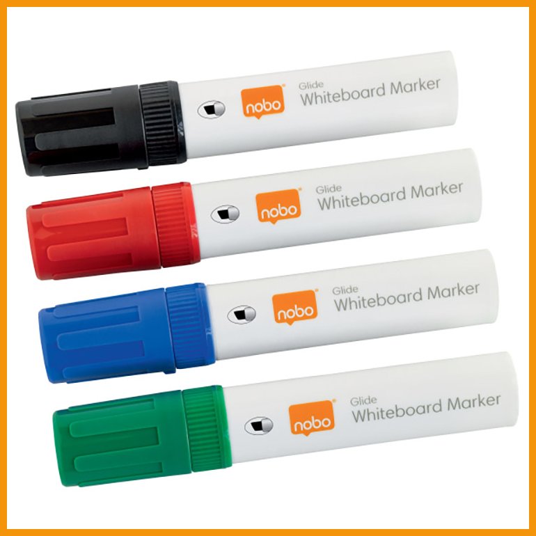 Nobo Glide Jumbo -valkotaulukynä sopii useimmille kuivapyyhittäville pinnoille, kuten lasitauluille ja sekä emali- että melamiinivalkotauluille. Miedosti tuoksuva muste kuivuu nopeasti.Musteen väri: musta, sininen, punainen ja vihreä
