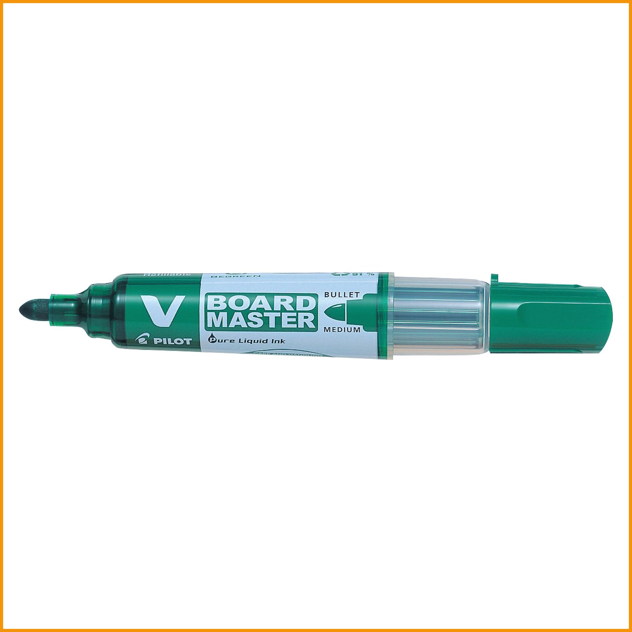 Hinta 1,75€ / kplUudelleentäytettävä pilot begreen v board master -valkotaulukynä on valmistettu 91-prosenttisesti kierrätysmateriaaleista. sen nopeasti kuivuva, mietotuoksuinen ja hyvin juokseva muste on helposti pyyhittävissä. pyöreä kärki, viivan leveys 2,3 mm. myyntierä: 1 / 10 / 100.