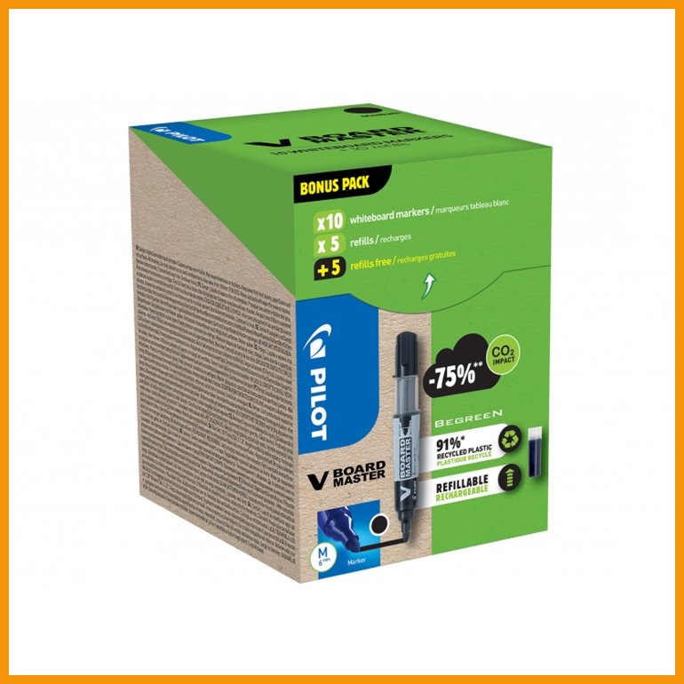 Hinta 1,72€ / kplUudelleentäytettävä pilot begreen v board master -valkotaulukynä on valmistettu 91-prosenttisesti kierrätysmateriaaleista. sen nopeasti kuivuva, mietotuoksuinen ja hyvin juokseva muste on helposti pyyhittävissä. pyöreä kärki, viivan leveys 2,3 mm. myyntierä: 1 / 10 / 100.