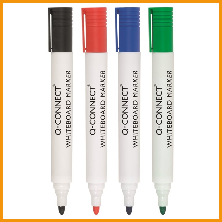 Q-Connectin valkotaulukynät on valmistettu 50-prosenttisesti GRS-sertifioidusta kierrätysmuovista.Sekä valko- että lehtiötauluille soveltuvan kynän miedosti tuoksuva muste on xyleenitöntä ja pyyhkiytyy valkotaululta helposti kuivalla kankaalla. Mustetta riittää 200 metrin kirjoittamiseen. Vaakatasossa säilytettävät kynät eivät kuivu, vaikka korkki unohtuisi auki 8 tunniksi.