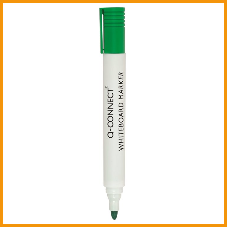 Q-Connectin valkotaulukynät on valmistettu 50-prosenttisesti GRS-sertifioidusta kierrätysmuovista. Miedosti tuoksuva muste on xyleenitöntä ja pyyhkiytyy valkotaululta helposti kuivalla kankaalla. Mustetta riittää 200 metrin kirjoittamiseen. Vaakatasossa säilytettävät kynät eivät kuivu, vaikka korkki unohtuisi auki 8 tunniksi.Musteen väri: vihreä