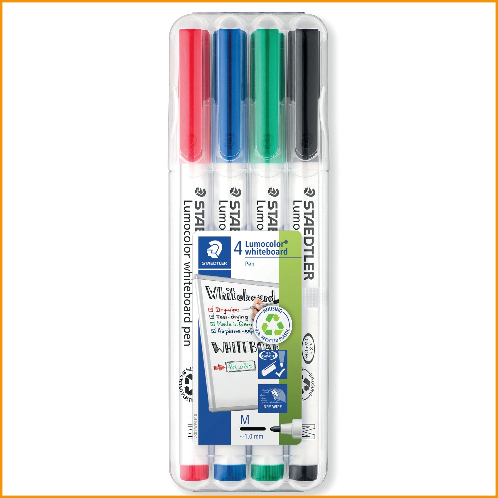 Hinta 7,36€ / 4 kplVesiliukoinen staedtler lumocolor 351 -valkotaulukynä on helppo pyyhkiä taulupyyhkimellä tai liinalla. kynässä on mietotuoksuinen, nopeasti kuivuva muste. korkki voi olla auki useita päiviä musteen kuivumatta. pakkauksessa on neljä väriä: musta, vihreä, sininen ja ...