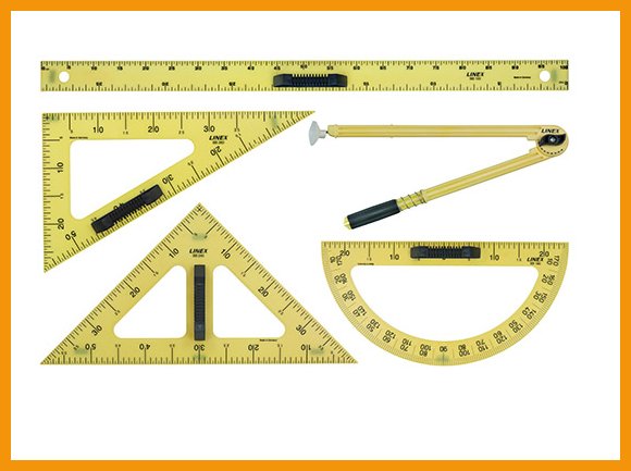 Keltaisesta muovista valmistettuun tauluviivainsettiin kuuluu 100 cm tauluviivain, tauluharppi, 45/90 ja 30/60 asteen taulukolmiot sekä 180 asteen tauluastemitta (halkaisija 340 mm). Viivaimissa on kädensijat ja kumiset liukuesteet.
