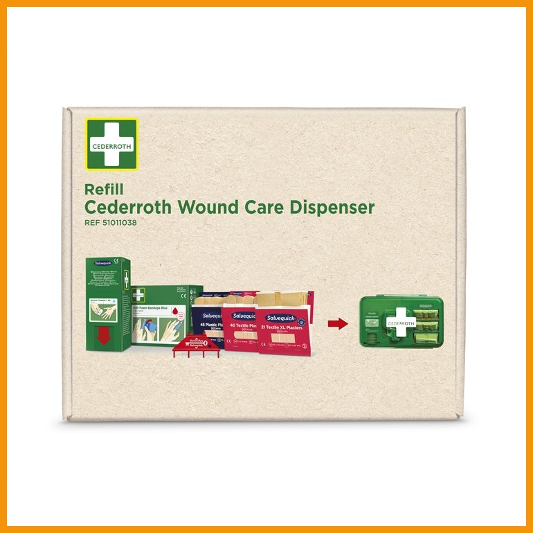 Cederrothin Haavanhoitoautomaatin (verkkokaupassamme tuotekoodilla 277058) täyttöpakkaus sisältää täydellisen setin täyttöpakkauksia esimerkiksi vanhentuneiden tai loppuneiden tuotteiden uusimiseksi.Cederroth-tuotekoodi: 51011038