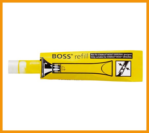 Täyttösäiliö Stabilo Boss Original- ja Green Boss -korostuskyniin. Yksittäispakattu tuote on helppokäyttöinen: vedä täyttösäiliö kynän kärjen yli ja anna kynän imeä muste sisäänsä.