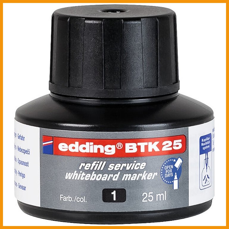 Edding BTK 25 on eddingin valkotaulukynille kehitetty täyttöväri, joka täyttää kynän mustesäiliön helposti ja suttaamatta. Muste nousee kapillaarisesti säiliöstä siihen pystysuoraan asetettuun kynään. Jätä kynä paikoilleen vähintään tunniksi tai mieluiten yön yli, niin se on jälleen valmis käytettäväksi.