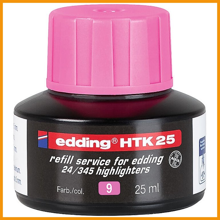 Edding BTK 25 on eddingin korostuskynille kehitetty täyttöväri, joka täyttää kynän mustesäiliön helposti ja suttaamatta. Muste nousee kapillaarisesti säiliöstä siihen pystysuoraan asetettuun kynään. Jätä kynä paikoilleen vähintään tunniksi tai mieluiten yön yli, niin se on jälleen valmis käytettäväksi.