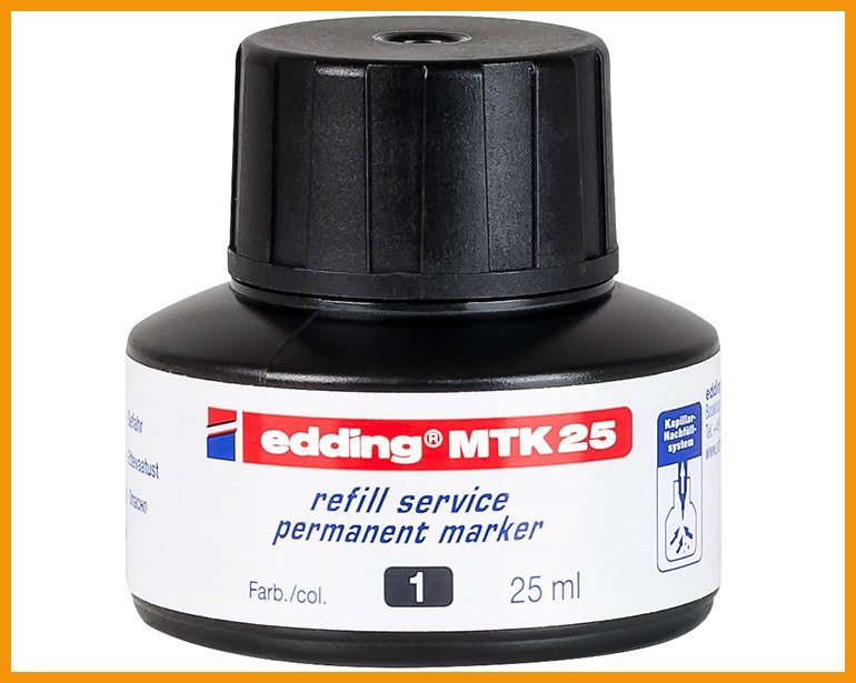 Eddingin pysyvämusteisiin merkkauskyniin sopiva täyttöväri MTK 25 täyttää kynät helposti ja suttaamatta. Kapillaari-ilmiötä hyväksikäyttäen muste nousee säiliöstä kynään, kun se on asetettu säiliöön pystysuoraan. Jätä kynä paikoilleen vähintään tunniksi tai mieluiten yön yli, niin se on jälleen valmis käytettäväksi. Sopii eddingin merkkauskyniin No.1, 21, 22, 300, 330, 400, 404, 2000, 2200, 3000 ja 3300.