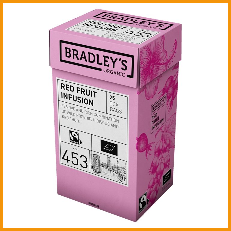 Bradley's Organic Red Fruit Infusion on Reilun kaupan luomuhauduke. Ruusunmarjan, vadelman ja mustaherukan makuinen sekoitus on aromikas ja täysin kofeiiniton.Pakkauksessa on neljä 25 pussin laatikkoa, eli yhteensä 100 pussia.