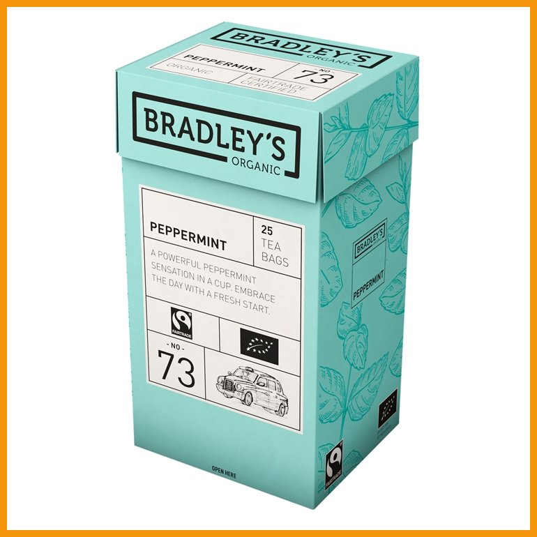 Bradley's Organic Peppermint on Reilun kaupan luomuhauduke. Raikas piparminttu virkistää kehoa ja mieltä.Pakkauksessa on neljä 25 pussin laatikkoa, eli yhteensä 100 pussia.