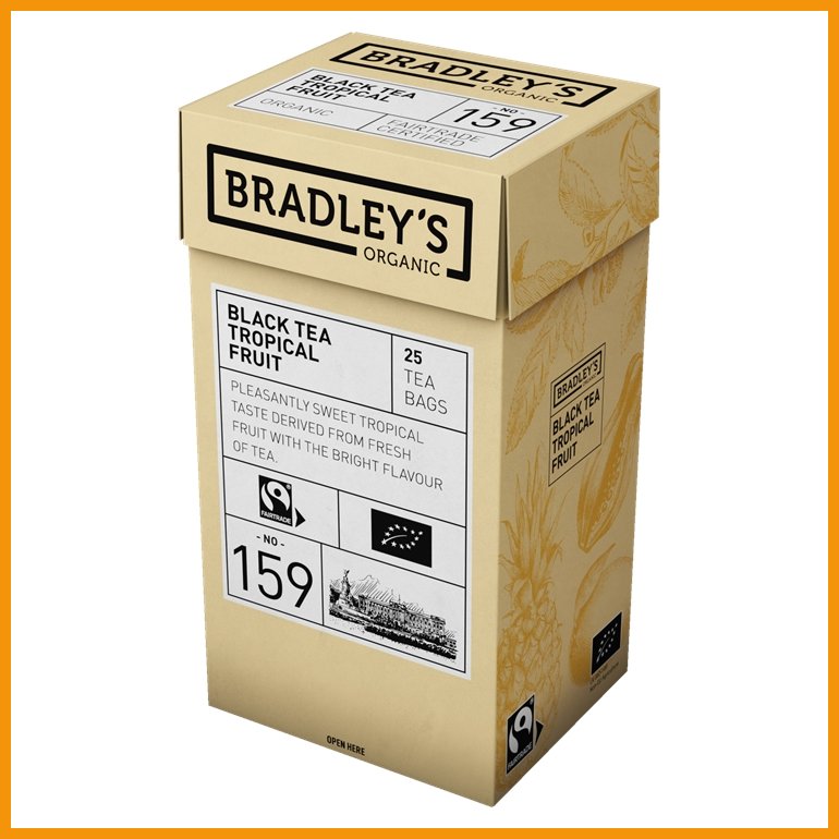 Bradley's Organic Tropical Fruit on Reilun kaupan musta luomutee. Eksoottisten hedelmien aromeilla maustettu tee on elämys vailla vertaa.Pakkauksessa on neljä 25 teepussin laatikkoa, eli yhteensä 100 teepussia.