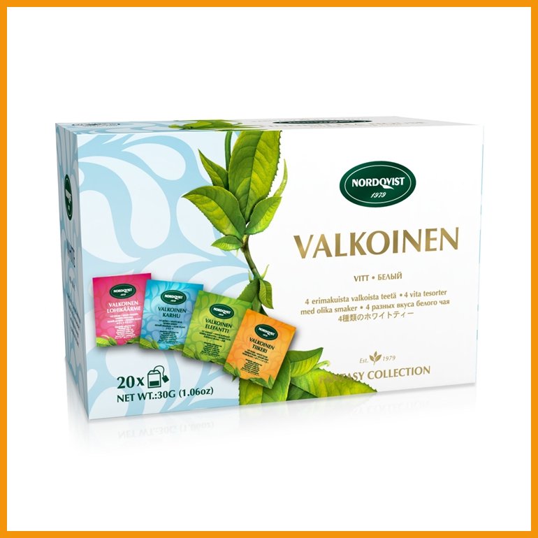 Nordqvistin Valkoinen on neljän maukkaan valkoisen teen lajitelma. Kiinasta kotoisin oleva valkoinen tee on maultaan hennompi kuin musta tai vihreä lajitoverinsa. Pakkauksessa on 20 pussia maittavia ja virkistäviä makuja:5 x Valkoinen Karhu: valkoinen tee, ruiskukka, mustikkamuffinssiaromi.