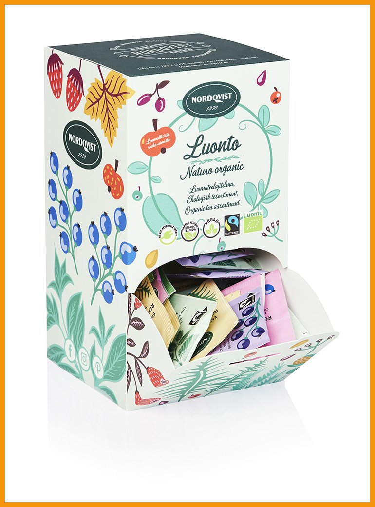 Norqvistin Luonto on Reilun Kaupan luomuteelajitelma, joka sisältää yhteensä 100 teepussin verran niin valkoisen, vihreän ja mustan teen kuin rooiboksenkin makuja.Sisältö: