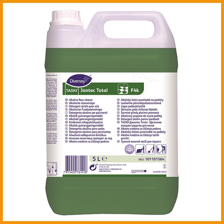 Taski Jontec Total on emäksinen tehopuhdistusaine käsittelemittömille ja vettä sietäville pinnoille sekä käsi- että konemenetelmiin. Nopeavaikutteinen aine tehoaa vaikeidenkin tahrojen, kuten pinttyneen lian, nikotiinivärjäytymien ja koronjälkien poistamiseen. Samalla se neutraloi pahat hajut O.N.T. -teknologian avulla ja jättää niiden tilalle raikkaan ja pitkäkestoisen tuoksun.Pakkauskoko: 5 litraa