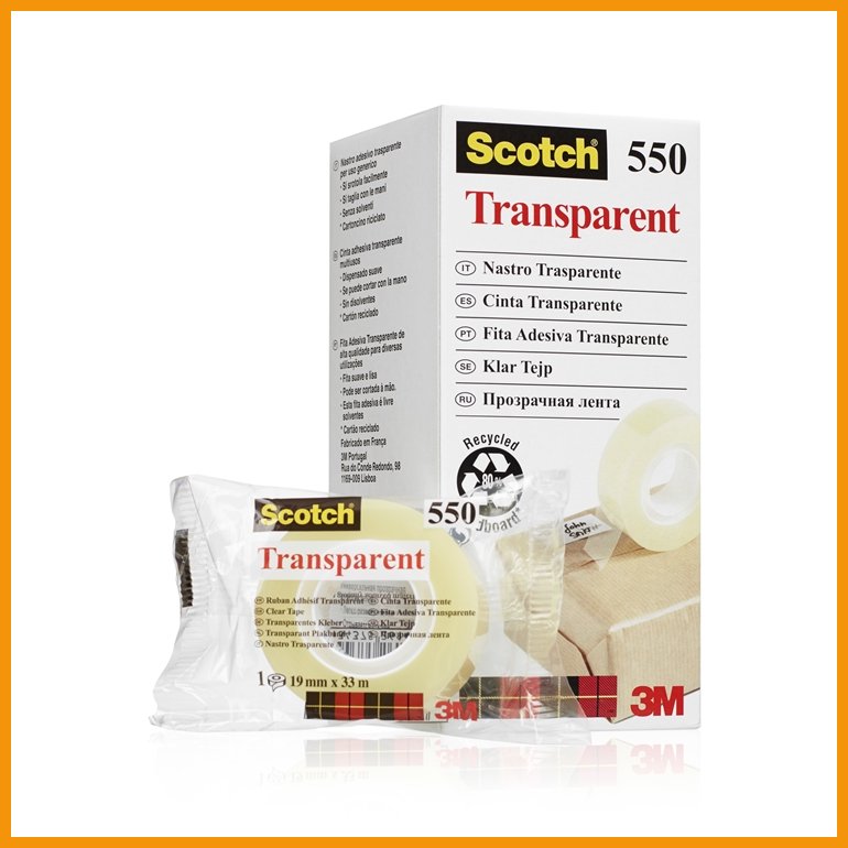 Scotch 550 on erittäin vahva ja kestävä teippi, joka kiinnittää pitävästi. Kirkas ja kiiltäväpintainen teippi ei kellastu eikä kuivu ajan myötä. Se soveltuu erinomaisesti esim. Pienien pakettien ja kirjekuorien sulkemiseen, julisteiden kiinnittämiseen tai pieneen korjailuun.Mitat: 19 mm x 33 m