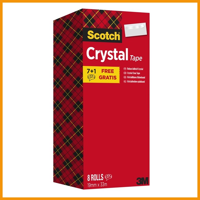 Scotch Crystal Tape on erittäin vahva ja kestävä teippi, joka kiinnittää pitävästi. Kirkas ja kiiltäväpintainen teippi ei kellastu eikä kuivu ajan myötä. Se soveltuu erinomaisesti etiketin suojaksi, paketointiin, sulkuun ja korjaamiseen.Mitat: 19 mm x 33 m