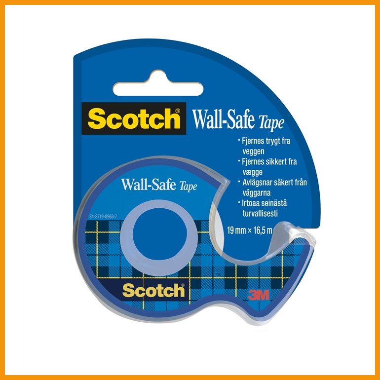 Scotch Wall-Safe on etenkin valokuvien, piirustusten, koristeiden ja muistilappujen seinälle kiinnittämiseen suunniteltu teippi. Niin maalattuihin seiniin, ruostumattomaan teräkseen, puuhun, keraamisiin laattoihin, peileihin kuin ikkunoihinkin kiinnittyvän teipin avulla paperit pysyvät sekä tiukasti kiinni että ne on helppo irrottaa seinäpintaa vaurioittamatta. Mukana on myös katkaisija.Rullan mitat: 19 mm x 16,5 m