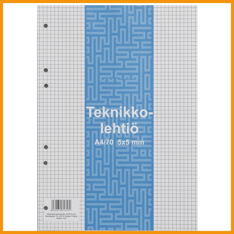 Liimaselkäinen lehtiö jossa 5 x 5 mm ruudutus. Yleisreijitys joka sopii 8-12 cm ja 8-8-8 cm mekanismiin. 70 lehteä. Valkoinen paperi 60g.Teknikkolehtiö A4/70 5X5 liimaselkä on korkealaatuinen toimistotarvike, jonka verkkokauppatilauksen toimitus perille kestää 1-2 päivää.