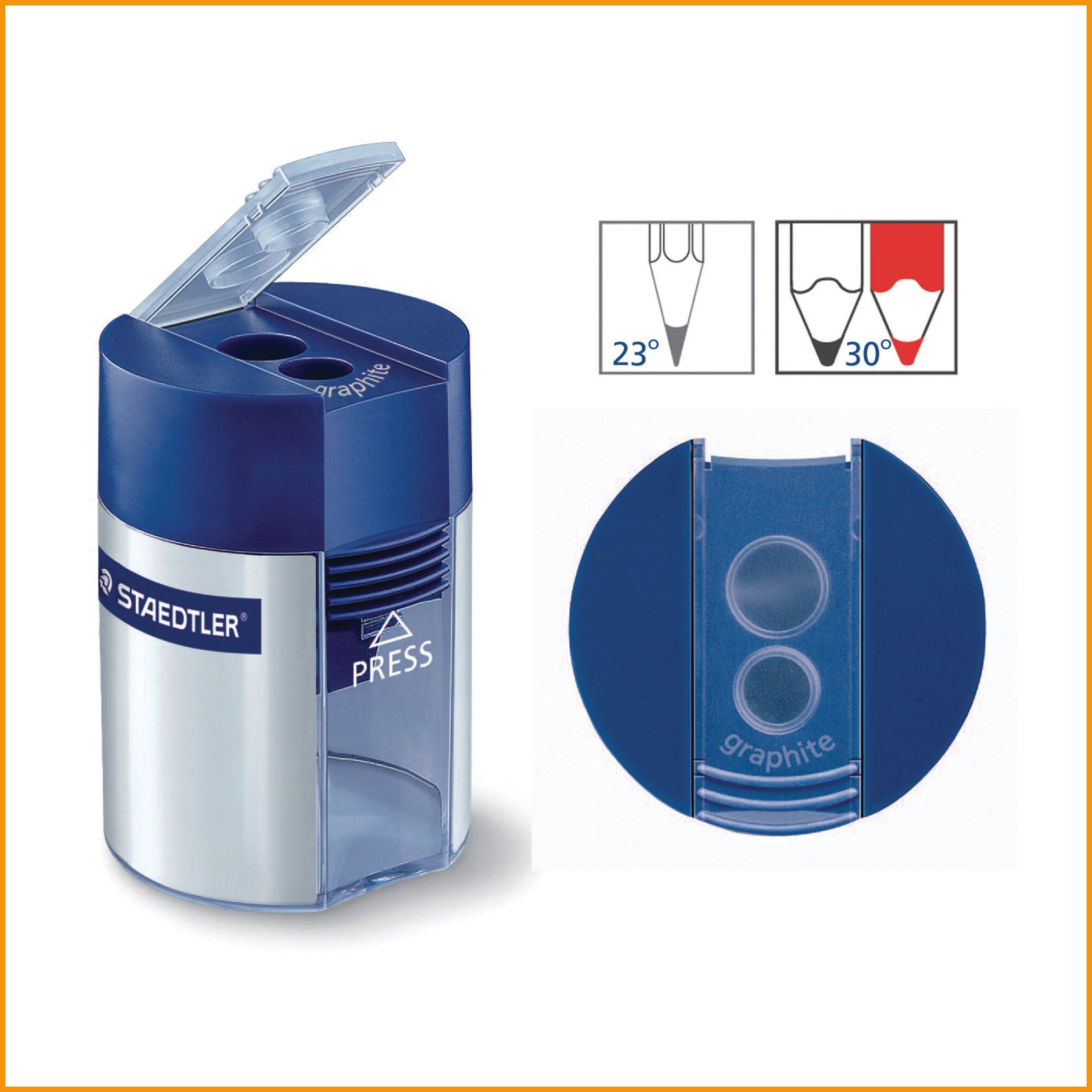 Staedtler 512001 on metalliteräinen kynänteroitin kahdella eri kokoisella reiällä. reikien ympärysmitat: 8,2 mm ja 10,2 mm.Teroitin Staedtler 512001 2-reikäinen on korkealaatuinen toimistotuote, jonka toimituksen kesto on verkkokaupasta tilattuna 1-2 päivää.