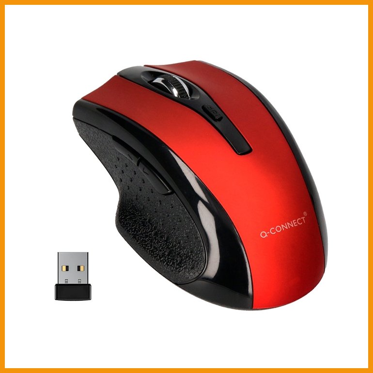 Q-Connectin langaton ja tarkka optinen hiiri sopii sekä oikea- että vasenkätisille, joskin eteen- ja taaksepäin vievät näppäimet ovat oikeakätisen peukalon puolella. Pienikokoinen nanovastaanotin lähes katoaa USB-porttiin.Väri: punainen/musta