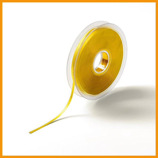 Molemmin puolin kauniin kiiltävä satiininauha vaatetukseen, askarteluun, koristeluun, lettinauhaksi. 100% polyesterisatiini. Leveys 3 mm, rullassa 50 m. Keltainen.Jos haluat tilata täysin pakkauksin, niin RLL on 1 kappaletta.