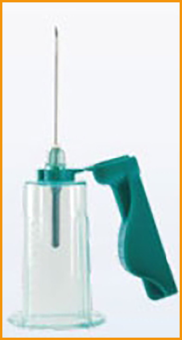 Steriili QuickShield Complete Plus -turvaneula ohjaimella. Neulan turvasuojus on kiinnitetty ohjaimeen ja neulan läpinäkyvä keskiosa toimii ikkunana.Koko: 21G x 1 1/2 (38 mm)