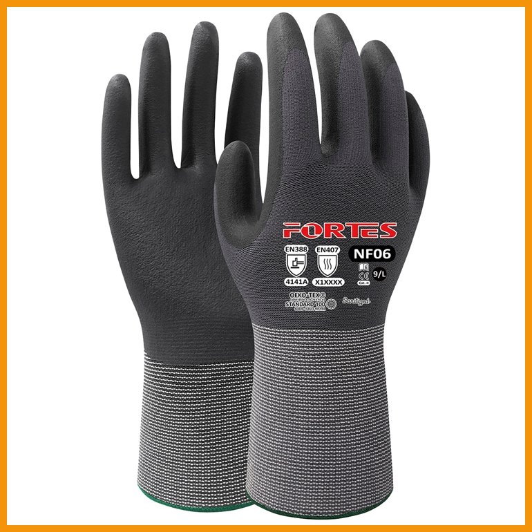 Fortes NF06 on ohut, vuoriton ja joustava käsine, jonka tiukka istuvuus ja nitriilipinnoite takaavat erinomaisen otepidon sekä kuivilla että liukkailla pinnoilla. Saumaton neulos tuntuu mukavalta ja hengittää hyvin. Käsineet soveltuvat hyvin monenlaisiin rakennus-, asennus-, varasto- ja tarkkuustöihin.Koko: 11