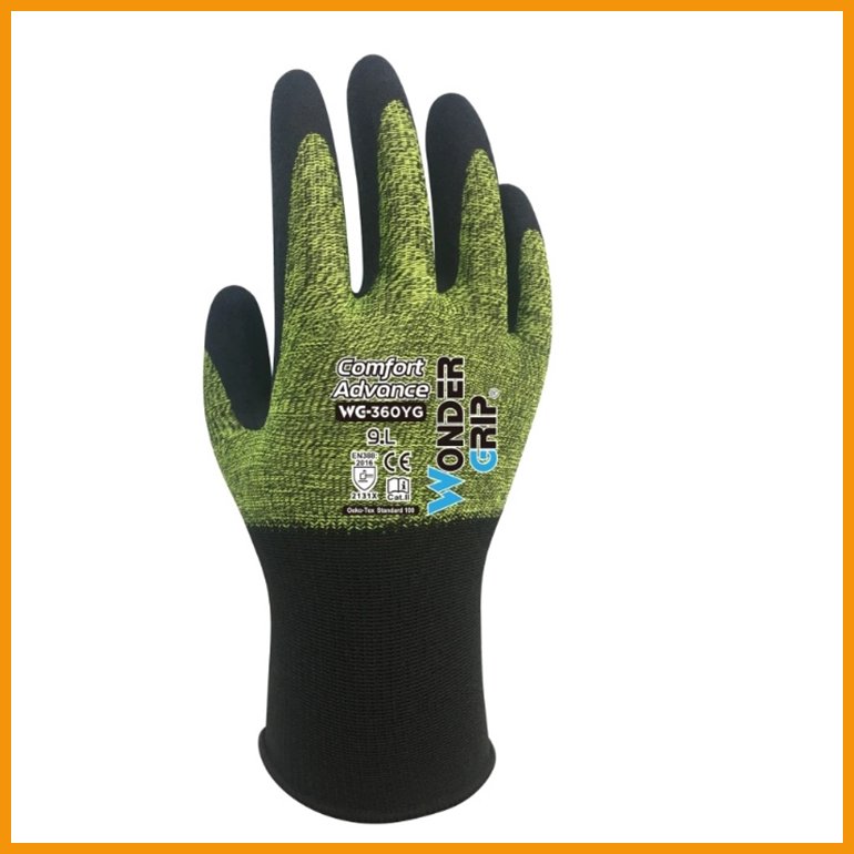 Wonder Grip WG-360YG Comfort Advance antaa käyttäjälleen erinomaisen pidon, tarkkuuden ja suorituskyvyn. Taipuisa käsine on lateksipinnoitettu erittäin ohuen vuoren päälle. Wonder Grip -pinnoite antaa erinomaisen pidon sekä kuivissa että märissä ympäristöissä ja toimii myös kosketusnäytöillä.Koko: 10