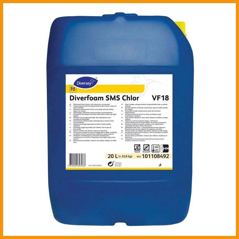 Diversey Diverfoam SMS Chlor VF18 on klooripitoinen ja silikaattivapaa vaahtopesuaine, joka soveltuu myös kevytmetalleille. Aine irrottaa tehokkaasti rasvalikaa, verta ja proteiineja ja huuhtoutuu helposti.