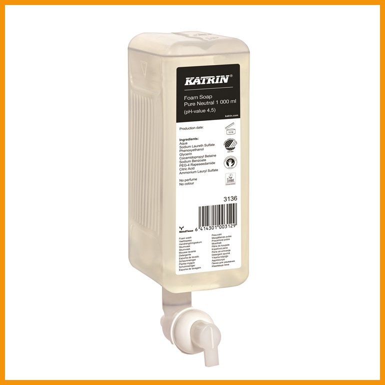 Katrin Foam Soap Clean on hajusteeton ja iholle hellävarainen vaahtosaippua, jonka pehmeä vaahto jättää kädet puhtaiksi ja kostutetuiksi. 2500 annokseen riittävä pakkaus sopii 1000 ml Katrin -saippua-annostelijaan.Dermatologisesti testatulla tuottella on sekä EU Ecolabel -ympäristösertifikaatti että pohjoismainen Joutsenmerkki.