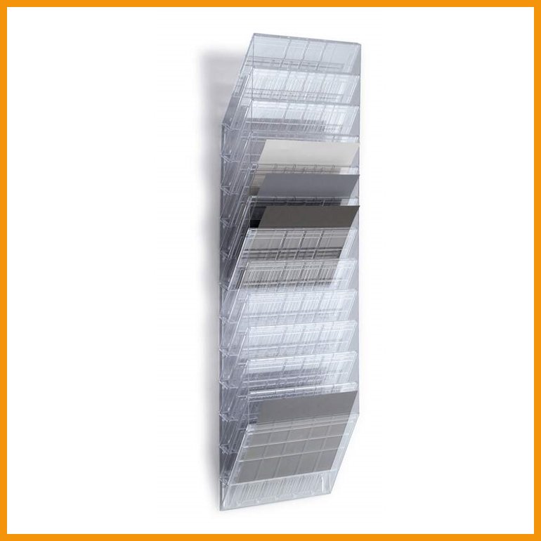 Durable Flexiboxx -sarjan seinään kiinnitettävässä esitetelineessä on 12 vaakasuuntaista lokeroa A4-kokoisille esitteille. Teline on valmistettu kirkkaasta muovista.Mitat: 1045 x 348 x 95 mm