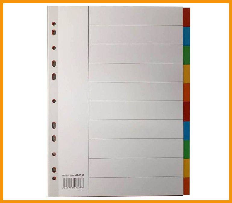 Esselten 10-osaisessa hakemistossa on blankot, värilliset välilehdet. 160 gsm kartongista valmistetussa hakemistossa on yleisrei'itys. Tuotteessa ei ole erillisiä muovikääreitä.Koko: A4 (297 x 225 mm)
