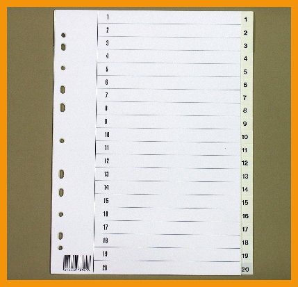Esselten 20-osaisessa numerohakemistossa on valkoiset kartonkiset (130 g) lehdet sekä numeroin 1-20 painettu etusivu ja kielekkeet. Hakemistossa on yleisrei'itys.Koko: A4 (297 x 225 mm)