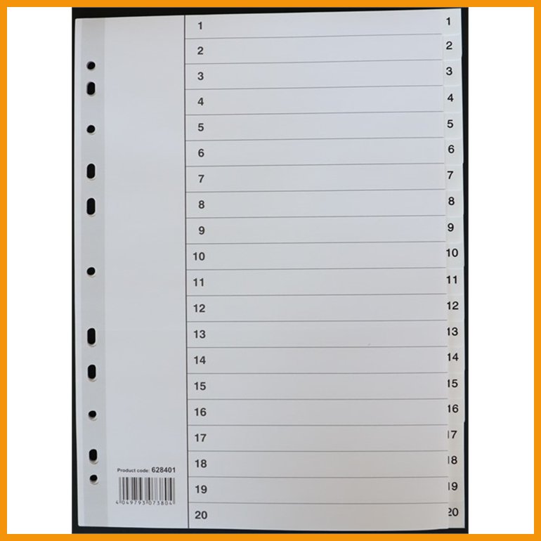 Esselten 20-osaisessa numerohakemistossa on valkoiset kartonkiset (130 g) lehdet sekä numeroin 1-20 painettu etusivu ja kielekkeet. Hakemistossa on yleisrei'itys. Tuotteessa ei ole erillisiä muovikääreitä.Koko: A4 (297 x 225 mm)