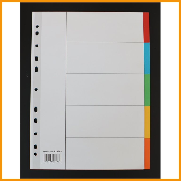 Esselten 5-osaisessa hakemistossa on blankot, värilliset välilehdet. 160 gsm kartongista valmistetussa hakemistossa on yleisrei'itys. Tuotteessa ei ole erillisiä muovikääreitä.Koko: A4 (297 x 225 mm)