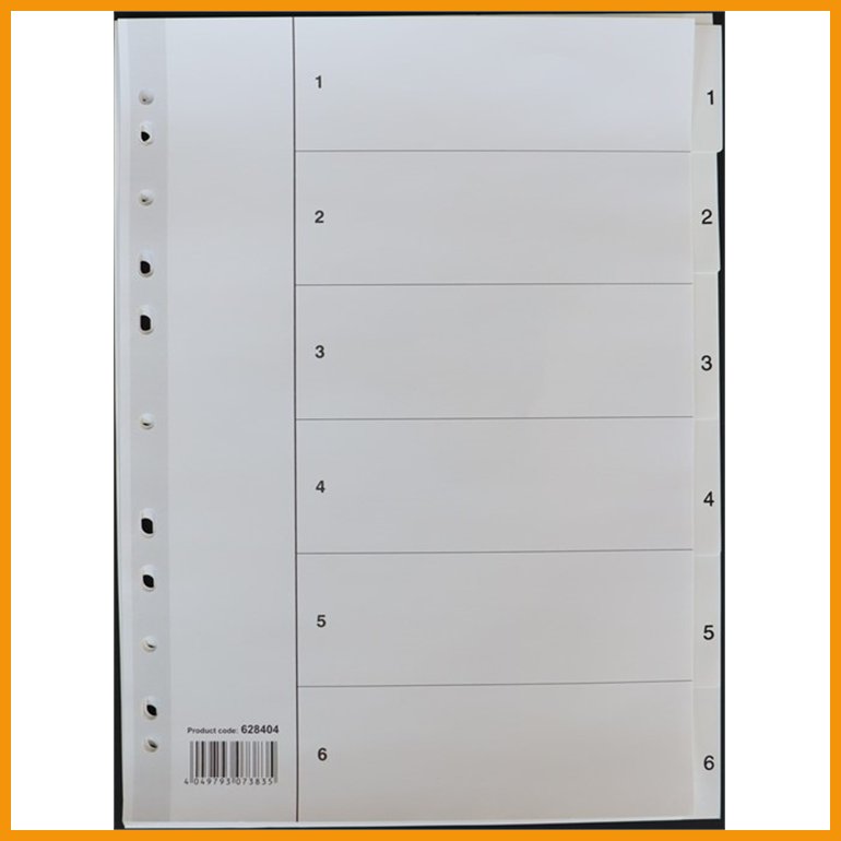 Esselten 6-osaisessa numerohakemistossa on valkoiset kartonkiset (130 g) lehdet sekä numeroin 1-6 painettu etusivu ja kielekkeet. Hakemistossa on yleisrei'itys. Tuotteessa ei ole erillisiä muovikääreitä.Koko: A4 (297 x 225 mm)