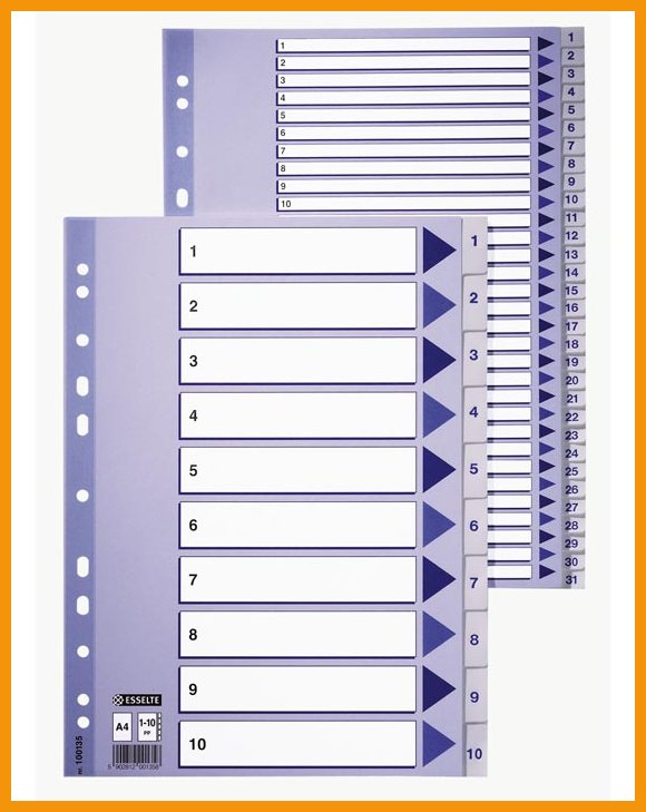 Esselten 12-osaisessa numerohakemistossa on PP-muoviset lehdet sekä numeroin 1-12 painettu etusivu ja kielekkeet. Nuolikuvio selkeyttää luettelointia. Hakemistossa on vahvistetut mapitusreiät ja yleisrei'itys.Koko: A4