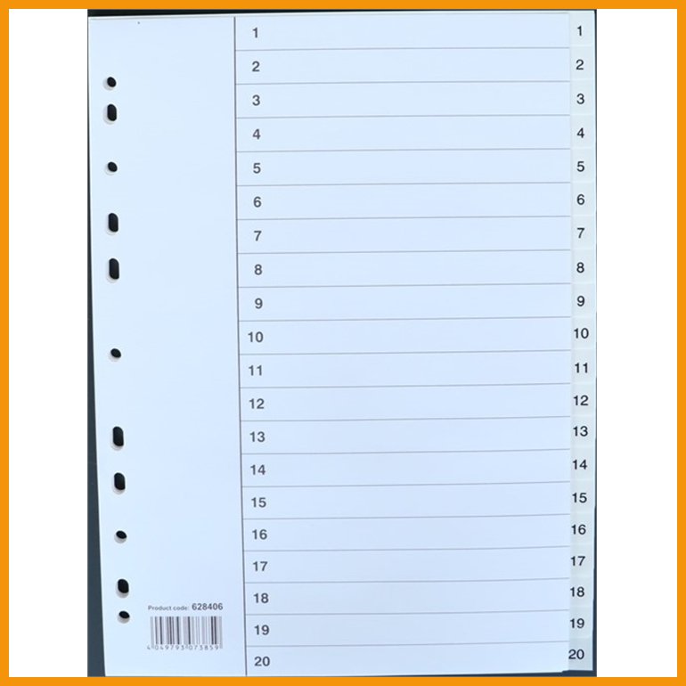 Esselten 20-osaisessa numerohakemistossa on valkoiset PP-muoviset (115 mic) lehdet sekä numeroin 1-20 painettu etusivu ja kielekkeet. Etulehti on 130 gsm kartonkia. Hakemistossa on yleisrei'itys. Tuotteessa ei ole erillisiä muovikääreitä.Koko: A4 (297 x 225 mm)