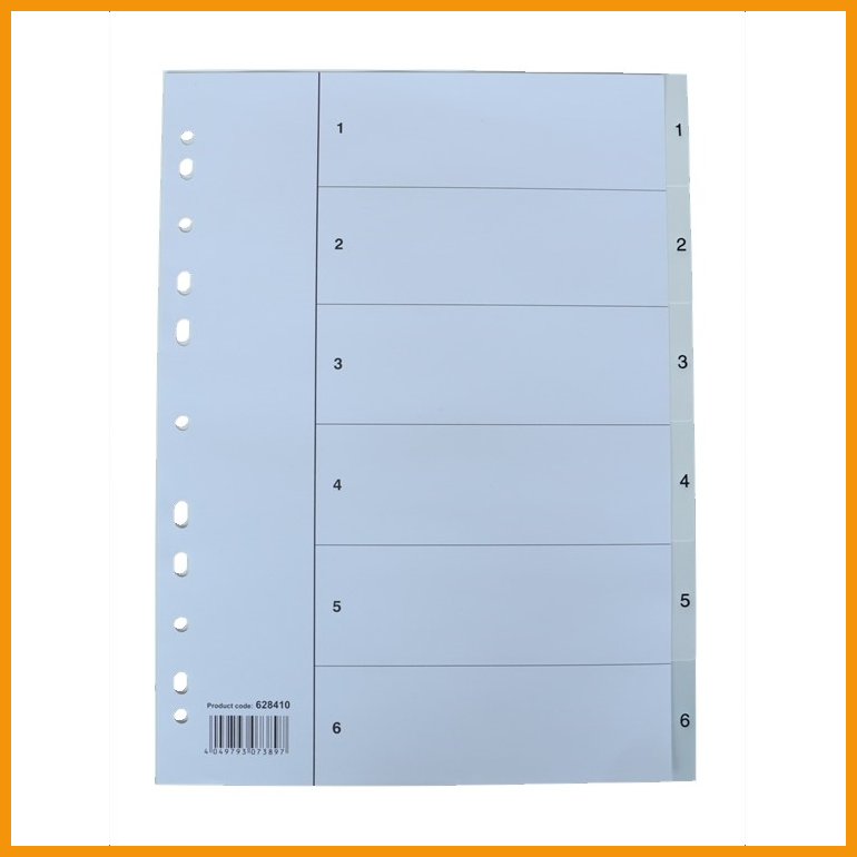 Esselten 6-osaisessa numerohakemistossa on valkoiset PP-muoviset (115 mic) lehdet sekä numeroin 1-6 painettu etusivu ja kielekkeet. Etulehti on 130 gsm kartonkia. Hakemistossa on yleisrei'itys. Tuotteessa ei ole erillisiä muovikääreitä.Koko: A4 (297 x 225 mm)