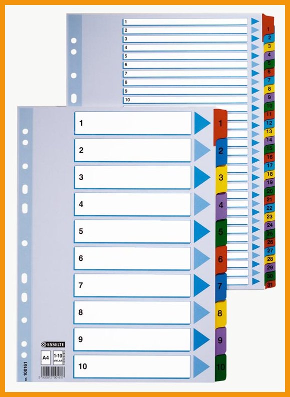 10-osaisessa Esselte Mylar -hakemistossa on värilliset, numeroin 1-10 painetut ja muovilla vahvistetut kielekkeet. 160 gsm kartongista valmistetussa hakemistossa on vahvistettu rei'itysliuska etusivulla ja yleisrei'itys.Koko: A4 (297 x 225 mm)